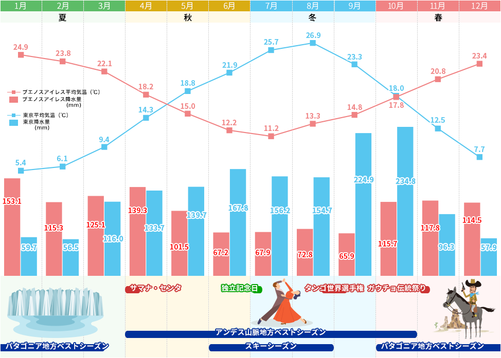 アルゼンチンは南緯22度~55度にまたがる南北に長い国で、北部のサバンナ気候~温暖湿潤気候、中部の乾燥したステップ気候、南部パタゴニアの砂漠気候~寒冷気候、また西部アンデス山脈の高山気候と地域によって様々です。