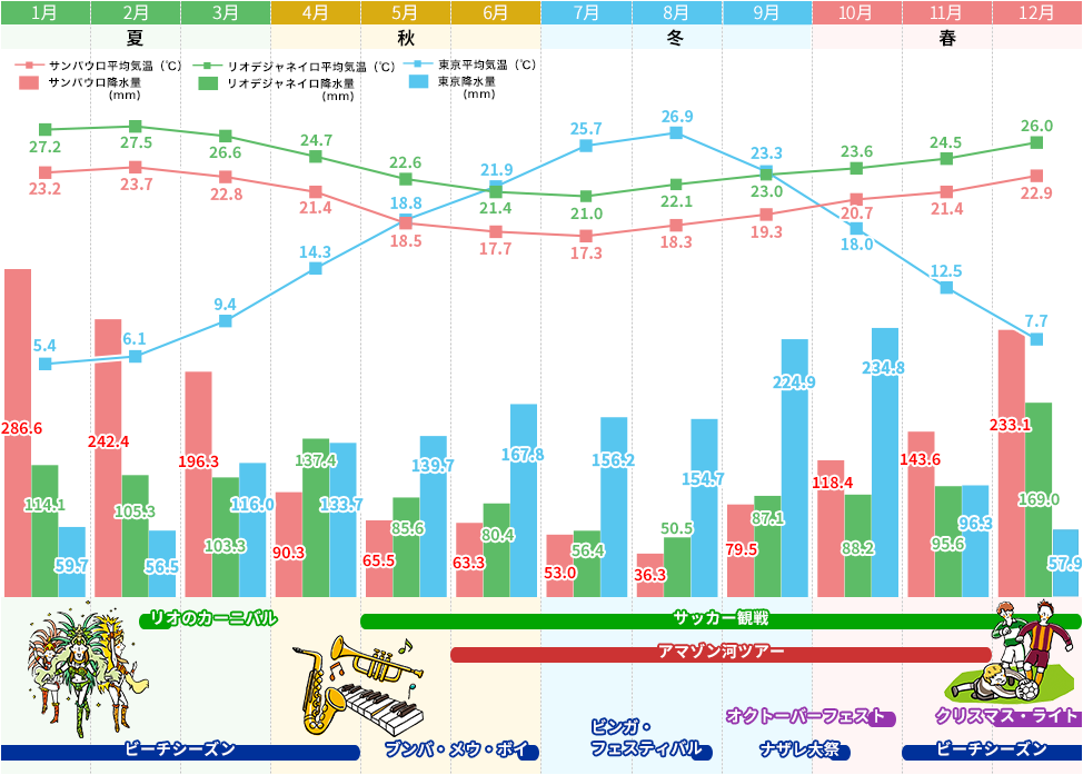 ※平均気温、降水量:サンパウロ、東京は国土交通省 気象庁ウェブサイト調べ