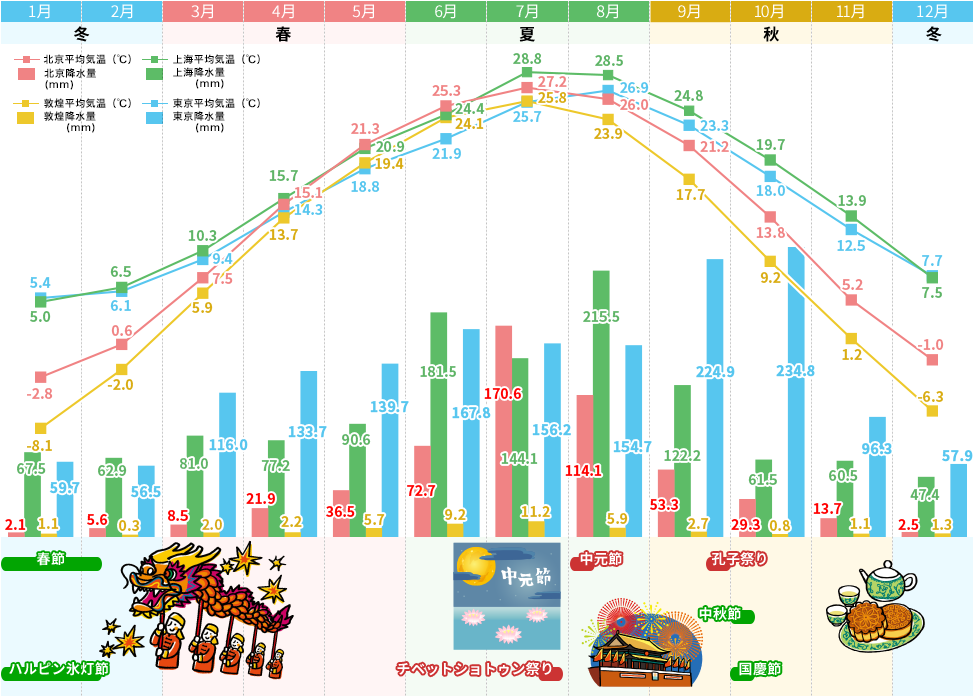 東京の気候に比較的近い上海、夏でも快適な気候の東北地方、夏の猛暑で知られる南の広州など、広大な中国は地域によって気候も様々。服装の準備は目的地の気候に合わせて。