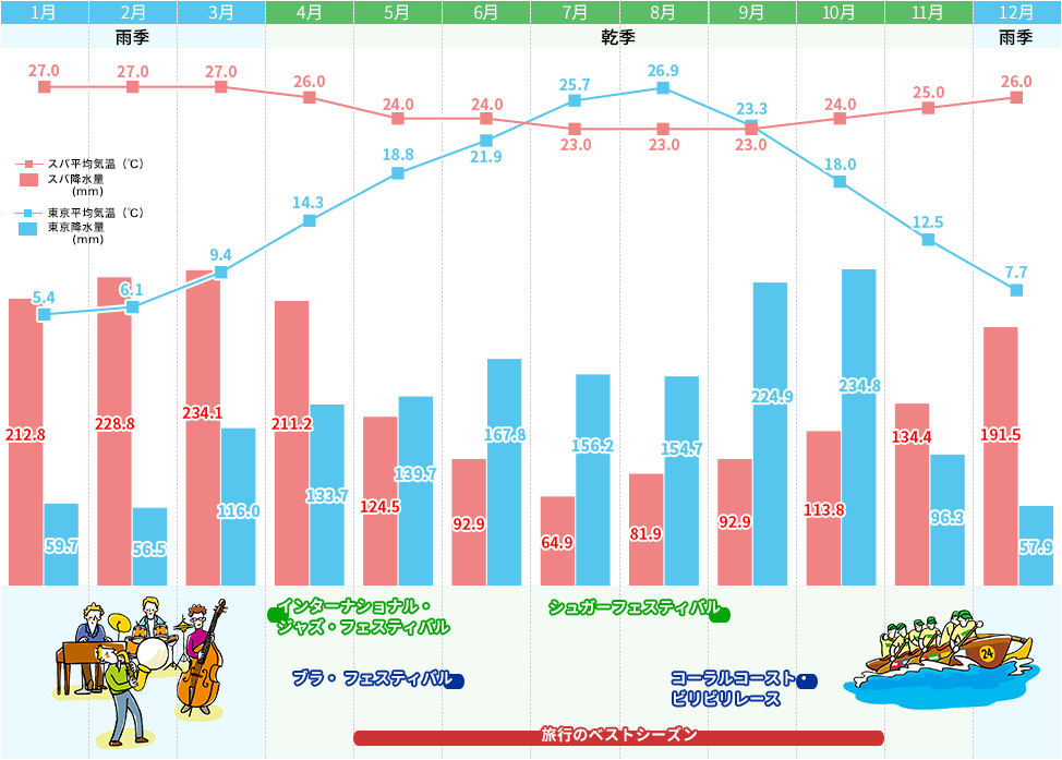 フィジーは月別の平均気温が最低23度、最高28度と、年間を通して気候に恵まれた常夏の国。日本の夏服をそのまま持って行けば、服装は大丈夫です。