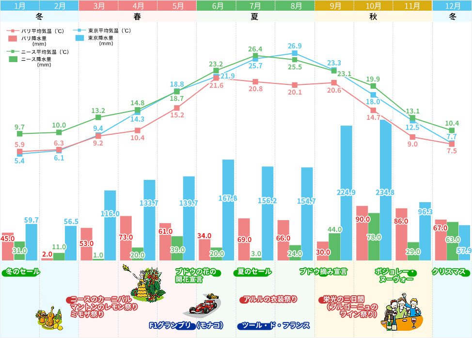 パリは年間を通して東京より5度位気温が低く乾燥していますが、南部は温暖です。