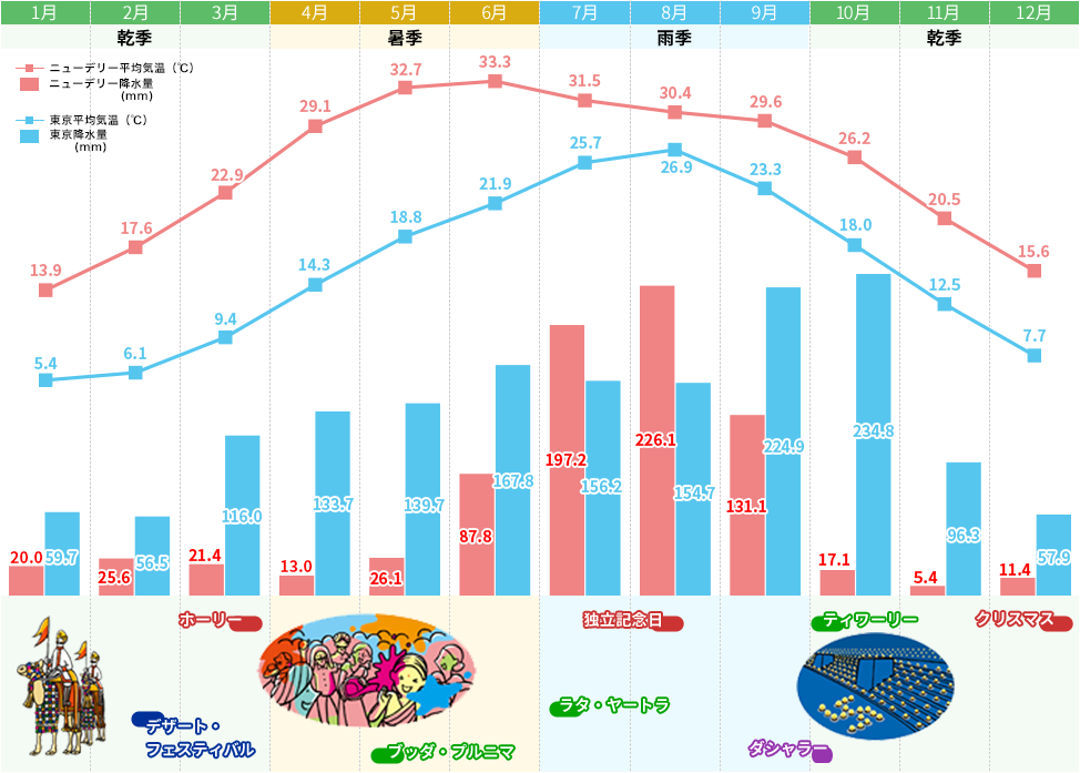 一般的にインドは暑い国というイメージが強いですが、場所や季節によって気候が異なります。旅の目的に応じて服装の準備をしましょう。