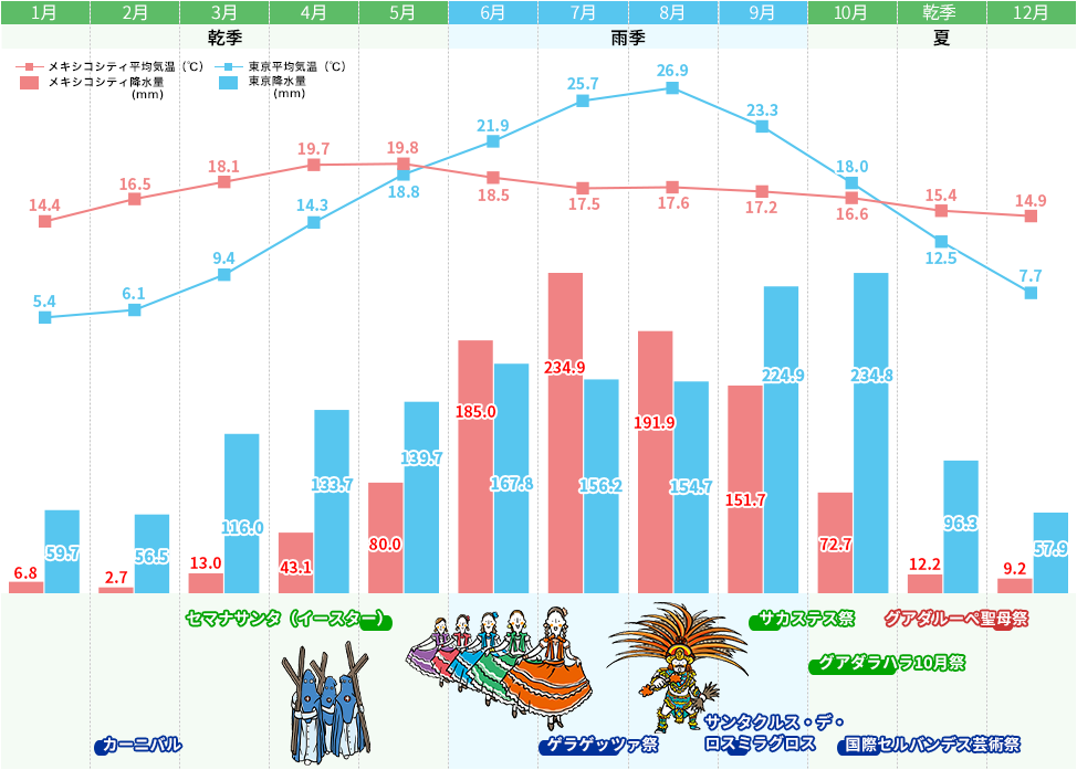 北半球にあるので寒い時期、暑い時期は日本と変わりませんが、雨季と乾季があり、亜熱帯の海岸、砂漠や高原、高温多湿のジャングルなど地域によって気候差があります。