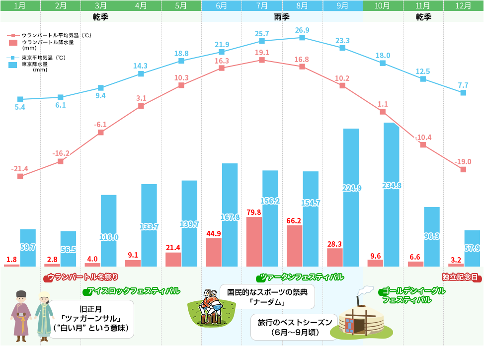 モンゴルは大陸性気候に属し、年間を通して乾燥しています。日中と朝晩の寒暖差が大きく、どの地域でも約20〜30℃近く差があります。
