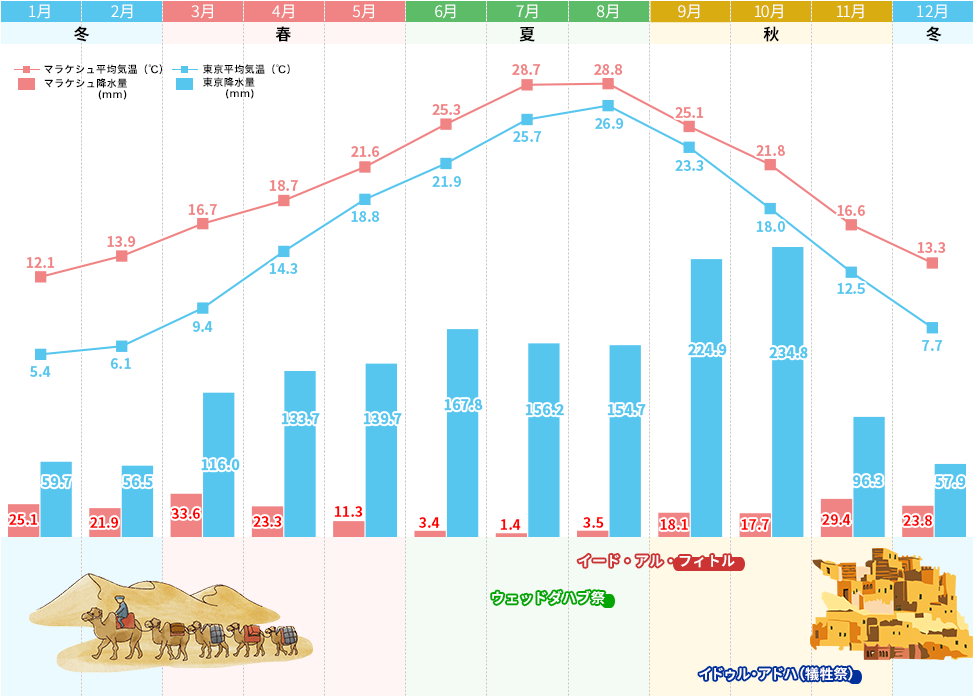 温暖な地中海沿岸や大西洋沿岸から内陸性気候のサハラ砂漠まで地域により気候は様々。また四季の変化もありますので、訪れる場所と季節に合わせて服装の準備を。