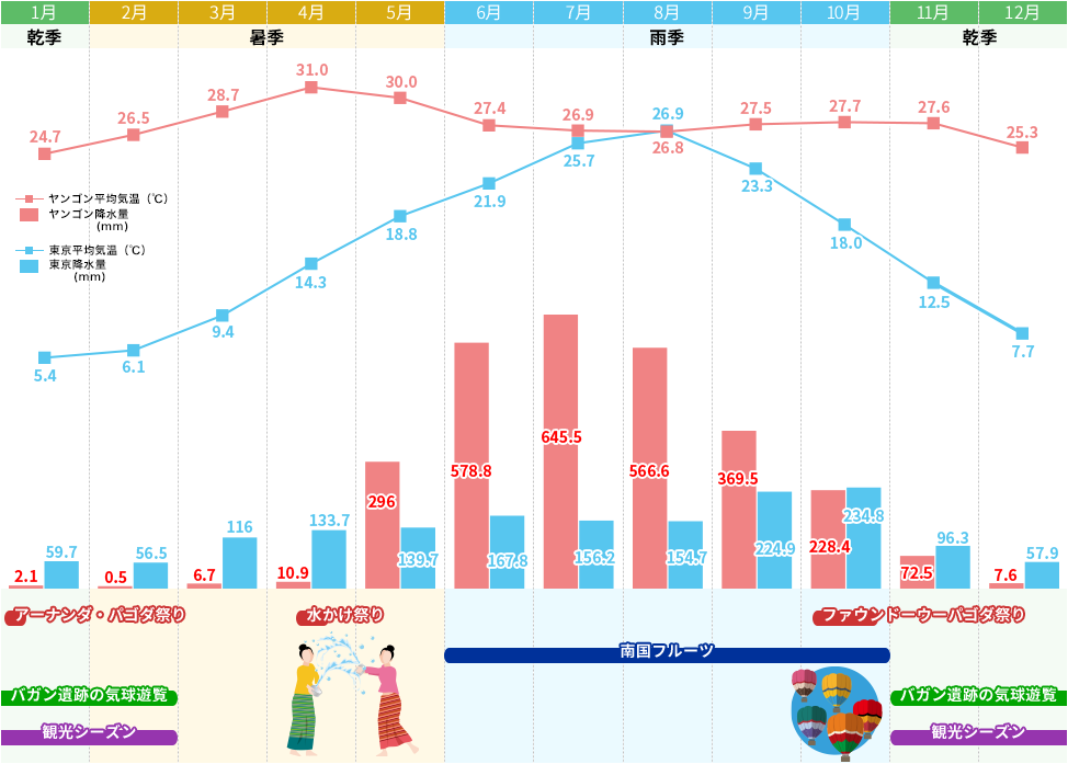 年間を通じて湿度が高いミャンマー。特に6月〜10月の雨季は降水量が増えるため、観光で訪れるなら11月〜1月の乾季がおすすめです。
