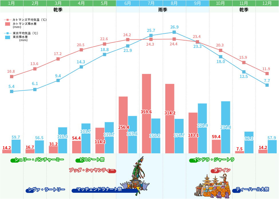 カトマンズの平均気温は国土交通省 気象庁ウェブサイト調べ、降水量は世界気象機関ウェブサイト調べ
