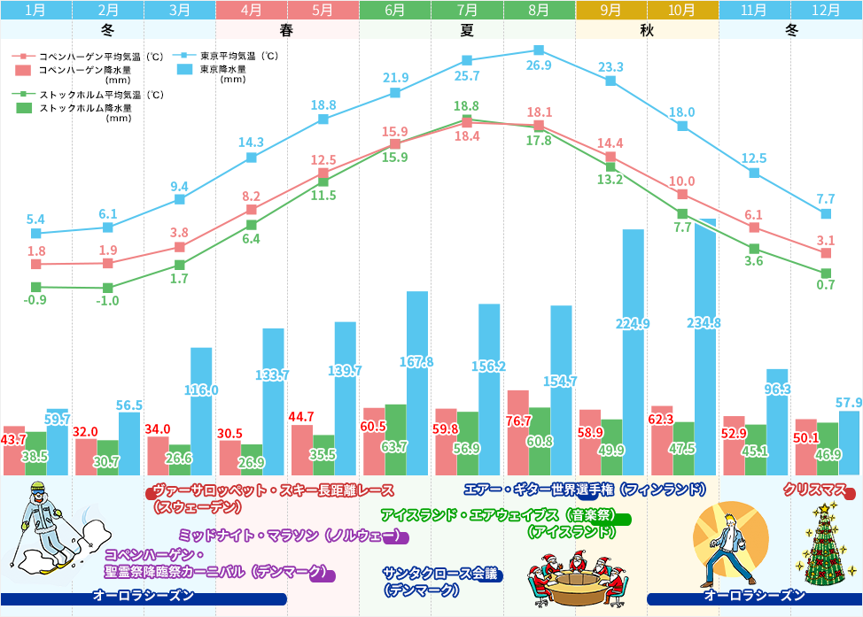 北極圏を除き、近海の暖流や地熱 (アイスランド)のおかげで、緯度のわりには冬も穏やかな気候です。一年を通じて湿度が低く、雨季はありません。