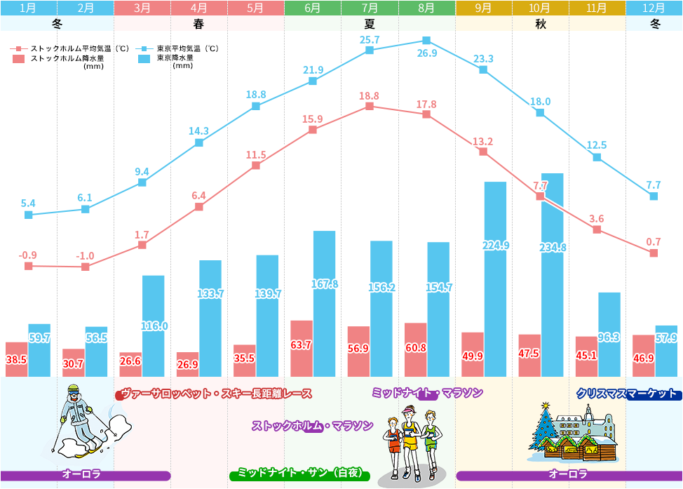 メキシコ湾流のおかげで、緯度のわりには比較的温暖ですが、北極圏の冬はやや厳しい気候です。四季ははっきりと分かれ、夏は極端に温度は高くなく、湿気もほとんどなく快適。