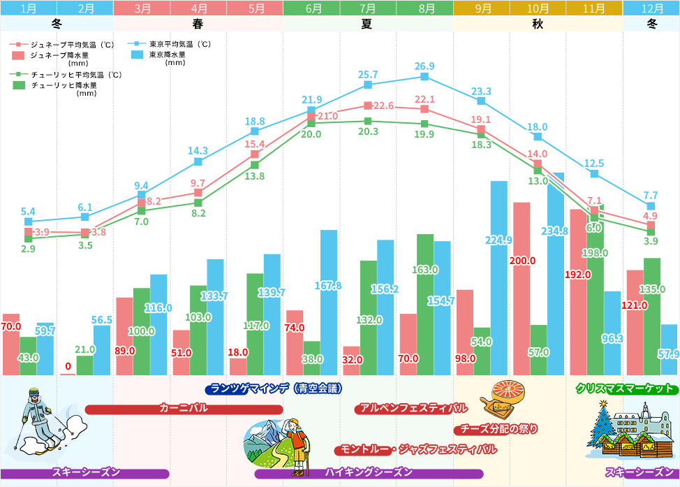 スイスは日本の北海道や高原のような気候です。しかし高低差があり、地域や標高により気候はかなり異なります。また内陸部にあるため、一日の気温が激しく変化します。