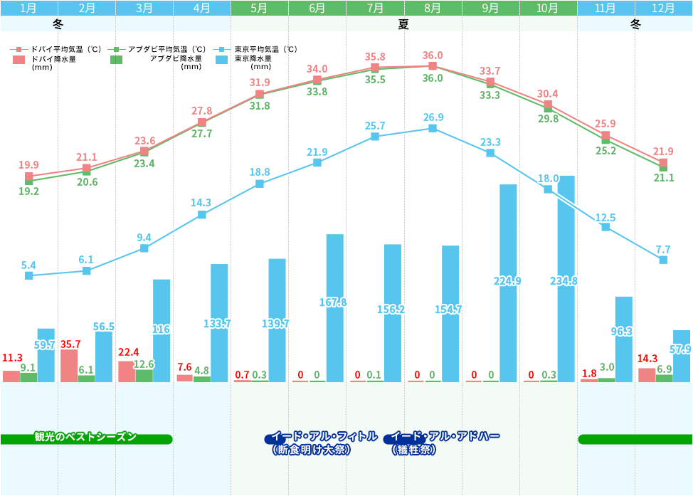 季節は大きく夏と冬に分けられ、基本的に雨は冬に数回降る程度。4月〜10月が夏にあたり、30度以上かつ高湿度という厳しい気候となる。一方で冬の時期は20〜30度程度に気温が落ち着き、夜間冷え込むことを除いて比較的過ごしやすい。