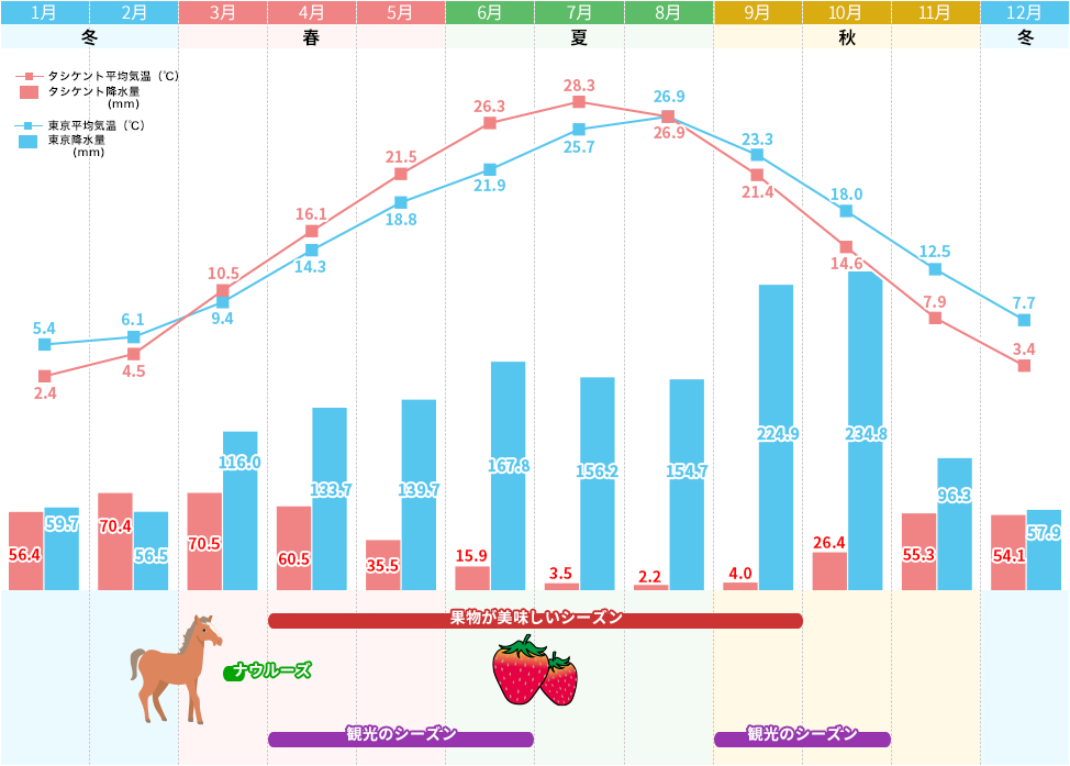 ウズベキスタンは年間降水量が少なく、夏は特に乾燥しています。昼夜・季節感の温度差が激しいのも特徴なので訪れる時期に合わせた準備を心がけましょう。