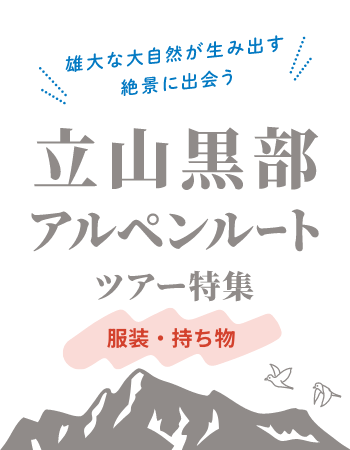 - 10度前後の気温で肌寒く、標高約2,500mの室堂平周辺では雪が降ることも。ウールやフリースなど暖かい素材による厚手の長袖の服や、帽子、ダウンベストやウィンドブレーカーなどの上着をご用意ください。