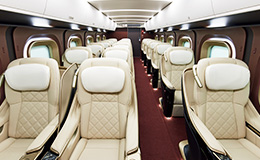 日本建築の美しさ、漆塗りの深い色彩が取り入れられたグランクラスは、上質で贅沢な空間が演出されています。本革張り(※)の座席は電動リクライニング機能の他、ダイニングテーブルや電源コンセントなど充実した機能が備わっています。(※)一部に合成皮革を使用