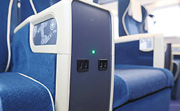 座席には格子柄が施され、朱色やグレーの色彩豊かで明るい空間が演出された普通車。新幹線の普通車では初めて、全ての座席に電源コンセントが設置されています。