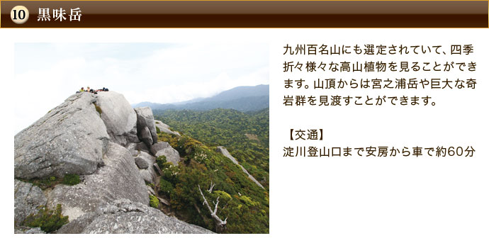 島の中央には九州最高峰の宮之浦岳をはじめ、1,800mを超す山々が連なり、すばらしい山岳美は「洋上アルプス」と称されるほどです。太古より独自の生態系を形成してきた屋久島は、標高差と黒潮の影響で、亜熱帯植物から高山植物まで約1,500種、日本の植物種の実に7割以上が1つの島に存在し、数多くの固有種が存在します。1993年12月には、白神山地とともに世界自然遺産に登録され、屋久杉自生林や宮之浦岳を含む、島の約20%にも及ぶ10,747haの森林が登録地域となりました。大自然の環境を活かしたアクティビティが盛んで、樹齢3,000年を超える屋久杉の原生林などをトレッキングしたり、カヤック、ウミガメの産卵見学など、エコツアーも充実しています。